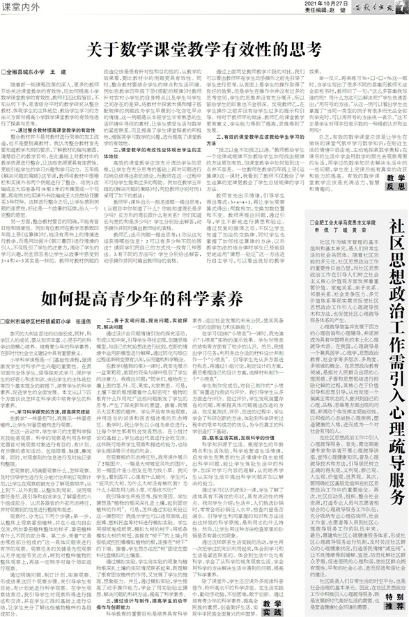 教 学实 践 如何提高青少年的科学素养 □宿州市埇桥区栏杆镇阚町小学 张道伟 参天的大树由茁壮的幼苗长成,同样,科学巨人的成长,要从知识丰富、心灵手巧的科学幼苗精心培养。培育青少年的科学素养,在新时代社会主义建设中具有重要意义。 小学科学课程是一门基础性课程,强调激发学生对科学产生兴趣的重要性。在贯彻面向全体学生、倡导探究式学习、保护学生的好奇心和求知欲、突出学生的主体地位等四个基本理念的前提下,培育学生的科学素养、促进学生的全面发展。本文从以下四个方面谈谈怎样在科学课中培育学生的科学素养。 一、学习科学探究的方法,提高探究技能 在教学“一株番茄”时,我展示一株番茄植株,让学生对番茄植株进行观察。 在这一活动中,学生学习的主要科学探究技能是观察。科学的观察是利用各种感觉器官对被观察对象进行有目的、有计划、有步骤的感知活动。包括眼看、触摸、鼻闻等。同时,对观察到的信息进行及时地记录和整理。 在观察前,明确要观察什么、怎样观察。及时引导学生进行充分地讨论并制订观察计划,让学生在观察前就充分了解观察顺序:从上到下、从外到里、从整体到局部。说明观察任务后,我引导和启发学生了解番茄的六个组成部分。认识各器官的外部形态特征,并对观察到的信息进行整理和表述。 观察时,分为以下两个步骤:第一步,从整体上观察番茄植株,并在小组内自由交流,例如番茄植株整体的样子,番茄植株有什么不同的部分等。第二步,带着“它是由哪些部分组成的”这一具体问题来进行有序的观察。观察任务的关键是先把观察从无序地细节关注点,转到对整株植物的整体观察上,再按一定顺序对每个局部进行观察。 通过明确问题、制订计划、实施观察、形成结果这四个观察步骤,来引导学生有目地、有计划地进行科学观察。在学生观察结束后,我引导学生对观察所得进行描述和交流,并在学生汇报的基础上进行总结,让学生充分了解这些植物植株的各组成部分。 二、善于发现问题、提出问题、实验探究、解决问题 通过设计由问题情境引发的探究活动,形成认知冲突,引导学生寻找证据,创建思维模型,与自己的初始想法进行比较,在新的情境中运用新模型进行解释,通过同化与顺应过程逐渐转变原有认知,从而建构科学概念。 在教学《植物的根》一课时,我首先展示一盆茉莉花,美丽的花朵与绿叶吸引了学生的注意力。我提出问题:“同学们,植物在土壤上面的茎、叶、花、果实,大家熟悉。可是,土壤下面的根埋藏着什么秘密呢?植物的根有什么作用呢?”这些问题激发了学生的思考,产生了探究新知的愿望。接着,我展示大豆和葱的植株。学生开始有序地观察,并用适当的词语和语言描述根的形态特征。教学时,我让学生以小组为单位进行,让每个学生都有机会发表想法。在小组讨论的基础上,学生选出代表进行全班交流。这样既可培养学生观察和描述的能力,也给学生提供展示才能的机会。 在观察根的形态特征后,我用课件展示了2幅图片。一幅是大树被狂风吹的图片,另一幅图片是小朋友在用力拔小草。我问学生,看到图片,心里有什么疑问。学生问:“狂风吹大树,为什么大树没有被吹倒?为什么小朋友用力拔小草,可是拔不动?” 我引导学生积极思考、探究原因。学生猜想是“植物的根深深扎进土壤,起到固定植株的作用”。可是,怎样通过实验来验证这一猜想呢?我提示学生可以选用报纸、扭扭棒、塑料托盘等材料进行模拟实验。学生用报纸卷成纸筒,模拟大树的树干;用纸条模拟大树的树冠,连接在“树干”的上端;用报纸或扭扭棒模拟植物的根,连接在“树干”的下端。接着,学生想办法把“树”固定在塑料托盘模拟的土壤里。 通过模拟实验,学生将实验的现象与植物根深扎土壤的实际情况联系起来,既理解了根有固定植株的作用,又发展了学生的推理、想象能力。并且,通过模拟实验,学生提高了动手操作能力,学会了用实验验证猜想、解决问题的科研方法,提高了科学素养。 三、通过设计与制作,提高学生的动手操作与创新能力 科学教育的重要目标是培养具有科学素养、适应社会发展的未来公民,使其具备一定的创新能力和实践能力。 在学习《自制“小喷泉”》一课时,我先演示“小喷泉”实物的演示效果。学生对喷泉的结构等方面有了初步的认识。然后,我提出学习任务:利用身边合适的材料设计并制作一个“小喷泉”。引导学生先从多方面进行构思,再通过小组讨论,制定设计的方案,最后根据自己的设计方案,选择材料制作一个“小喷泉”。 学生制作完成后,对自己制作的“小喷泉”装置进行测试与评价。我引导学生从多方面进行评价。经过评价,学生发现装置存在的问题,再根据具体问题提出改进的方法。在反复测试、评价、改进的过程中,学生学会了科研创新的方法,体验到科学研究过程中的艰辛与成功的快乐,为今后真正的科学创造打下基础。 四、联系生活实践,发现科学的价值 科学知识源于生活。根据学生的年龄特点和生活体验,科学地营造生活情境,启发学生在熟悉的生活情境中自主地提出科学问题,能让学生体验生活中的科学,加深对学习内容的理解,从而培养学生从实际生活中提出科学问题并加以解决的能力。 通过学习《认识液体》一课,学生了解了液体
