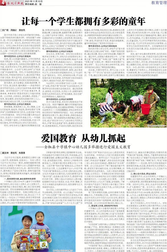 爱国教育 从幼儿抓起 ——全椒县十字镇中心幼儿园多举措进行爱国主义教育 □戴友坤 黄世凤 朱惠惠 习近平总书记强调,教育要把立德树人融入各环节,培根铸魂、启智润心。为深入贯彻习近平总书记的这一要求,准确把握教育的根本方向,全椒县十字镇中心幼儿园重新审视自身的办学思路和办学行为,统一教师的思想认识,最终确立了坚持五育并举,德育为基的理念,倡导以有温度的教育润泽童年,有深度的教育启迪未来。 一、园本课程为媒,融合德育特色课程 十字镇幼儿园以《3~6岁儿童学习与发展指南》为指引,结合当地人文特点、幼儿发展水平、教师素质能力等实际情况,精心制订园本课程实施大纲。同时将德育特色课程《辉煌中国》有机地融入到园本课程中。在确立课程之初,幼儿园成立了园本课程领导小组,经过近三个月的努力,一份包含三个年龄段,既有日常园本教育,又融合《辉煌中国》特色课程的园本大纲得以确定,并从2021年春季学期开始落地实施。 《辉煌中国》特色课程以国情教育为主线,内容涵盖古代中国的历史文明、科学成就;近代中国遭受侵略、奋勇抗战的事迹;当代中国自强不息、奋发图强的历程。按照幼儿年龄特点和接受能力,《辉煌中国》特色课程分为三个维度。小班开展“传统中国”教育活动,以传统节日的风俗习惯、人文故事展开设计;中班开展“历史中国”教育活动,以历史人物的成长过程、文化艺术成就为主要内容;大班的教育内容为“复兴中国”,走进烽火连天的岁月,感受新中国的日新月异。课程小组从中选取幼儿感兴趣、能理解的内容设计成语言、社会、科学、健康、艺术五大领域的游戏教学活动,做到德育与五大领域有机结合。 在9月份,小班的教师和幼儿们进行了中秋节主题课程,历时两周。幼儿们通过“中秋的来历”“中秋大团圆”了解中秋节的历史传说;吟诵古诗《嫦娥》《古朗月行》感受到汉语言的优美;通过《中秋果儿甜》《数月饼》领略节日传统美食,开展“学校的全家福”“八月十五月儿圆”“爷爷为我打月饼”等亲子活动让幼儿感受到现在生活的幸福。中班的幼儿们学习的是园本课程《秦始皇嬴政》。教师们设计了社会活动“万里长城”,科学活动“度量衡”,语言活动古诗《出塞二首》,音乐活动《长城谣》,健康活动“兵马俑”等等。幼儿们在活动中了解了秦始皇的雄才伟略,感受到万里长城的壮阔、兵马俑的精美,惊叹秦朝时的先进和强大。大班小朋友的课程是《祖国,生日快乐》。子课题分别有《学校的祖国大又美》《抗日战争胜利纪念日》《国歌》《国旗国旗我爱你》《九一八》《诗歌:长征》等等。一系列的活动带领幼儿们认识了国旗,会唱国歌,了解到中国共产党进行了艰苦的斗争才建立了新中国,理解了幸福的生活来之不易,从而树立热爱国家、建设国家的愿望。 有了园本课程的支撑,这样的德育不再是蜻蜓点水,不再是雁过无痕。教师和幼儿们在活动中共同认识中华悠久灿烂的文明,感受到新中国在党的领导下披荆斩棘、破茧重生的艰辛和自豪。幼儿们对活动印象深刻,情由心生。 二、营造育人环境,润物有声亦有形 十字镇幼儿园十分重视环境在育人中所起的重要作用。幼儿的年龄特点决定了直观教育更具有直接性,所以园区精心打造“红色经典”主题环境,使幼儿能在园所内闻其声、观其物,在德育的氛围中学习、生活、活动,成长为真正的中国娃。 “红色经典”主题环境从入园歌曲“听唱经典 浸润童心”开始。教导处精选出一批爱国主义歌曲,如《国家》《歌唱祖国》《中国,中国,鲜红的太阳永不落》等作为入园歌曲播放。每天早晨8点,校园内响起这些熟悉而又振奋人心的歌声,幼儿们在歌声中进行各种活动,歌曲表达的内容对幼儿的成长起着潜移默化的作用。送孩子的家长们也被歌声感染,轻轻哼唱唤起对国家和党的热爱。 “中国骄傲”是幼儿园廊道文化的主题。行走在教学楼的走廊里、楼梯上,你看到的是王二小、刘胡兰、小英雄雨来的手绘故事,抗美援朝英雄邱少云、黄继光的事迹图画;你看到的是“两弹元勋”钱学森、邓稼先、于敏等科学家的故事,“杂交水稻之父”袁隆平在试验田的场景;你看到的是“神舟”发射、“嫦娥”绕月、“蛟龙”深潜的场景图片……在这里,俯仰之间皆是挺起中国脊梁的英雄;在这里,都是学校为之骄傲的人和物;在这里生活的教师和幼儿们,又怎能不为之触动呢? 三、精心设计活动,师生共成长 在重要的节日、纪念日到来时,十字镇幼儿园精心设计组织活动,画展、朗诵、舞蹈形式不一,双拥进军营、消防零距离等保留活动制度化开展。活动中让师生、家长、社会多方位参与其中,扩大教育的广度。如今年五一期间,开展“童画·党的伟绩”为主题的亲子绘画活动。画展共收到亲子作品130余幅,画式新颖、内容丰富,从作品上能看到每位家长和幼儿们的用心。通过活动,增强幼儿和家长的爱国之情,激发幼儿树立报国之志。 星光不问赶路人,时光不负有心人。学校在实施爱国主义教育的过程中教师和幼儿们实现了共同成长,也收获颇丰。蔡远菁小朋友在唐洁教师指导下创作的儿童画《党的一百年纪念邮票》获得了滁州市金奖;尹可松小朋友在李林教师指导下创作的绘画《携手同心·砥砺前行》获得省优秀奖;任雪婷、唐洁教师指导