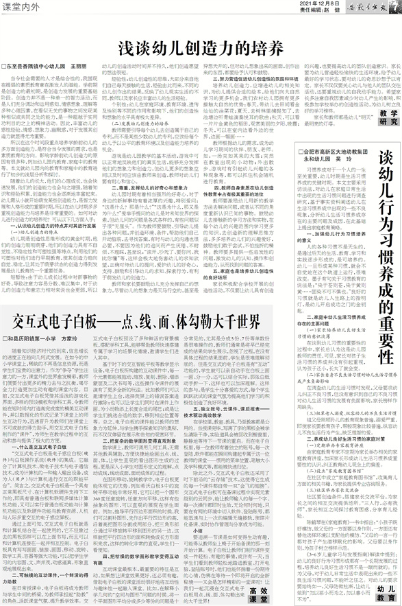 高 效课 堂 交互式电子白板——点、线、面、体勾勒大千世界 □和县历阳镇第一小学 方家玲 随着知识经济时代的到来,信息增长的速度正在趋向几何式发展。在如今的中小学课堂上,稀缺的不再是信息资源,而是学生们宝贵的注意力。作为“争夺”学生注意力的一方,课堂外的世界愈发精彩,教师们便要付出更多的精力去与之抗衡,竭尽全力打造更加生动有趣的课堂内容。目前,交互式电子白板凭借其活泼的游戏化界面、多样的预设模板和学科工具,令教师能在短时间内打造高完成度的精美互动课件,并以数据化的形式记录下课堂上的师生互动行为,迅速晋升为教师们在课堂上不可或缺的得力助手,用交互式电子白板制作的“课件”,为师生在教学过程中的互动和参与提供了极大的方便。 一、什么是交互式电子白板 “交互式电子白板是电子感应白板(硬件)与白板操作系统(软件)的集成。它融合了计算机技术、微电子技术与电子通信技术,成为计算机的一种输入输出设备,成为人(用户)与计算机进行交互的职能平台”。简言之,交互式电子白板是一个具有正常黑板尺寸、在计算机软硬件支持下工作的,即具有普通白板和联网多媒体计算机功能,又可以实行普通白板功能与计算机功能以及软硬件功能与教育资源、人机与人际多重交互的电子感应屏板。 通过上面可知,交互式电子白板就是和计算机结合在一起使用的,它不但像过去的黑板那样可以在上面书写,而且可以和计算机连接在一起并相互控制。电子白板具有写写画画、链接、画图、移动、旋转、数学工具、容器等强大功能,可以把学生学习的内容图、文、声并茂,动感逼真,形象直观地展现出来。 二、可触摸的互动课件,一个鲜活的得力助教 在日常授课中,电子白板将成为教师与学生中间的桥梁,为教师承担起“助教”的角色,活跃课堂气氛、提升教学效率。交互式电子白板预设了多种鲜活的背景模板,搭配学科工具,能够帮助教师快速搭建专属于学习的场景化情境,邀请学生们进入其中。 基于时下的交互智能平板等教学显示设备,电子白板所构建的互动课件中,每一个元素都能被拖动、缩放、复制、删除、增添蒙层及二次书写等,这些操作令课件的展演有了更多全新的玩法。比如教师们可以邀请学生上台,选择荧屏上的错误答案进行擦除;也可以让学生们同时在课件上作画,为小动物添上长度合适的尾巴;或是让学生们挑选合适的数字,移到相应位置等等。总之,电子白板的课件能以教师的想象力为延伸,与学生携手探索知识的奥秘,而不仅仅停留在展示和告知的观赏环节。 三、把复杂的数学图形变得直观形象 数学课上,教师可调用几何工具,无需其他教具辅助,方便快捷地绘画出点、线、面、体,让学生直观的看出图形生成的过程,更是深入小学生对图形定义的理解,点动成线,线动成面,面动成体的过程。 在图形移动,旋转教学中,电子白板更能体现它的优势,例如希沃白板5中的旋转平移功能非常好用,它可以把一个图形360度任意旋转,任意方向平移,这样有些抽象的图形,可以直观的展现在学生面前。例如,推导平行四边形面积的时候,我们可以割补图形,先作出平行四边形的高,沿着高把图形分割成两部分,把三角形部分通过平移旋转平移到图形的另一边,这样就把平行四边形的面积转换成长方形面积来求,这样的转化非常的直观,学生们一看便知。 四、把枯燥的数学图形教学变得互动有趣 互动课堂最根本,最重要的特征是互动,如果想让课堂效果更好,还必须有趣,借助电子白板的课堂活动很好地将互动性与趣味性一起融入课堂。比如,在解释小学几何的“空间与图形”问题的时候,将一个平面图形平均分成多少等份的问题是十分常见的,尤其是分成5份、7份等单数份是很难操作的,教师们通常是将早已经完成的结果向学生展示,忽视了过程,在没有具体过程的结果面前,学生是很难理解彻底的。但是交互式的电子白板是有“互动”功能的,学生就可以亲自动手在白板上画一画、分一分,还可以结合实际,那张白纸动手折一下,这样也可以加深理解。这样的参与,是学生十分喜爱的方式,每个学生跃跃欲试的课堂气氛为提高他们学习的积极性创造了良好环境。 五、独立账号、云课件、课后报表——技术驱动高效教学 在学校里,教室、教具,乃至教案都是公用的。当授课完毕,写满了字的黑板会被学生清除干净,实验道具会被回收到橱窗里,静静地等待下一节课的重启。而在电子白板里,每一位教师有着独立的账号,每一次登陆,软件都能在瞬间构建起专属于这一位教师的课堂——惯用的菜单位置、笔触大小及学科模式等,都能被快速归位。 除此之外,交互式电子白板还采用了时下前沿的“云存储”技术,这使得它生成的每一个课件都自带一双“会飞的翅膀”。交互式电子白板可在备课过程中实现元素级别的云同步,能让教师输入的每一个字、每一次操作都即时生效,无论何时何地,只要在有网的环境中切入软件、登陆账号,都能迅速与上一次的编辑无缝接轨,使碎片化备课、实时协作管理与分享成为可能。 小结 要追溯一节课是如何变得生动有趣,可能得从教师坐上椅子开始备课的那一刻开始计算。电子白板让教师们制作课件变成一件轻松、有趣的事情,或许有一天,当学生们看到教师轻松地踏进教室、打开电脑,登陆账号时