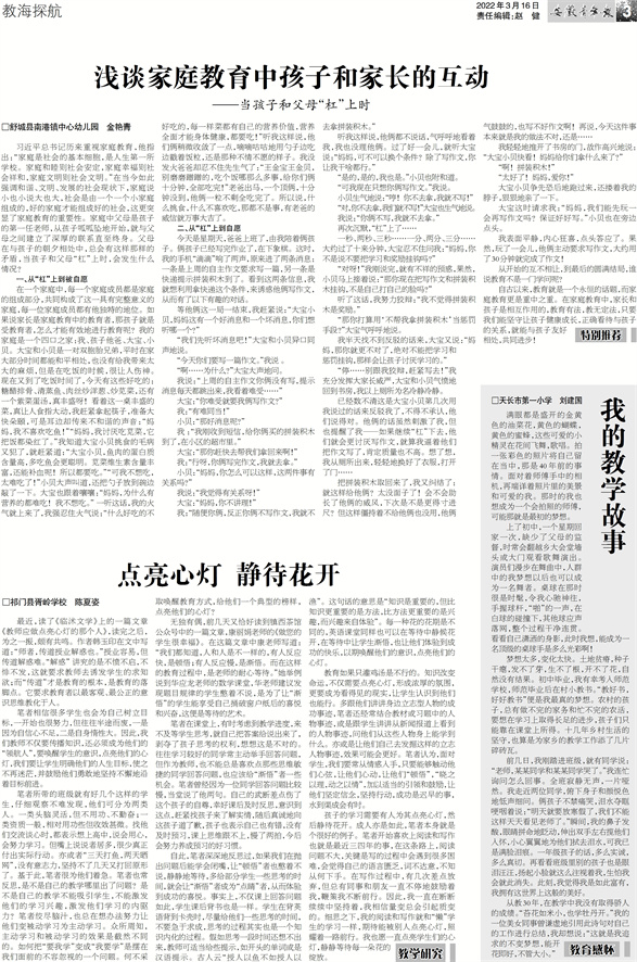 教学研究 点亮心灯 静待花开 □祁门县胥岭学校 陈夏姿 最近,读了《临沭文学》上的一篇文章《教师应做点亮心灯的那个人》,读完之后,为之一振,颇有共鸣。作者韩玉印在文中写道:“师者,传道授业解惑也。”授业容易,但传道解惑难。“解惑” 讲究的是不愤不启,不悱不发,这就要求教师去诱发学生的求知欲;而“传道”才是教育的根本,是教育的落脚点。它要求教育者以最客观、最公正的意识思维教化于人。 笔者相信很多学生也会为自己树立目标,一开始也很努力,但往往半途而废,一是因为自信心不足,二是自身惰性大。因此,我们教师不仅要传播知识,还必须成为他们的“领航人”,要唤醒学生的意识,点亮他们的心灯,我们要让学生明确他们的人生目标,使之不再迷茫,并鼓励他们勇敢地坚持不懈地沿着目标前进。 笔者所带的班级就有好几个这样的学生,仔细观察不难发现,他们可分为两类人。一类头脑灵活,但不用功、不勤奋;一类资质一般,相对用功些但收效甚微。找他们交流谈心时,都表示想上高中,说会用心,会努力学习。但嘴上说说者居多,很少真正付出实际行动。亦或者“三天打鱼,两天晒网”,没有意志力,坚持不了几天又打回原形了。基于此,笔者很为他们着急。笔者也常反思,是不是自己的教学哪里出了问题?是不是自己的教学不能吸引学生,不能激发他们的学习兴趣,激发他们学习的内驱力?笔者绞尽脑汁,也总在想办法努力让他们变被动学习为主动学习。众所周知,主动学习和被动学习的效果是截然不同的。如何把“要我学”变成“我要学”是摆在我们面前的不容忽视的一个问题。何不采取唤醒教育方式,给他们一个典型的榜样,点亮他们的心灯? 无独有偶,前几天又恰好读到镇西茶馆公众号中的一篇文章,康丽娟老师的《做您的学生很幸福》。在这篇文章中康老师写道:“我们都知道,人和人是不一样的,有人反应快,是顿悟;有人反应慢,是渐悟。而在这样的教育过程中,是老师的耐心等待。”她举例说到华应龙老师的数学课堂,华老师建议发现题目规律的学生憋着不说,是为了让“渐悟”的学生能享受自己捅破窗户纸后的喜悦和兴奋,这便是等待的艺术。 笔者在课堂上,有时考虑到教学进度,来不及等学生思考,就自己把答案给说出来了,剥夺了孩子思考的权利,想想这是不对的。往往学习较好的同学常主动举手回答问题,但作为教师,也不能总是喜欢点那些思维敏捷的同学回答问题,也应该给“渐悟”者一些机会。笔者曾经因为一位同学回答问题比较慢,当堂说了他两句。自己的武断差点伤了这个孩子的自尊,幸好课后及时反思,意识到这点,赶紧找孩子来了解实情,随后真诚地向这孩子道了歉,孩子也表示自己也有错,没有及时预习,课上思维跟不上,慢了两拍,今后会努力养成预习的好习惯。 自此,笔者深深地反思过,如果我们在抛出问题后能学会闭嘴,让“顿悟”者也憋着不说,静静地等待,多给部分学生一些思考的时间,就会让“渐悟”者成为“点睛”者,从而体验到成功的喜悦。事实上,不仅课上回答问题如此,学生课后背书也是一样。学生在背英语背到卡壳时,尽量给他们一些思考的时间,不要急于求成,思考的过程其实也是一个知识内化的过程。假如思考一段时间还想不出来,教师可适当给些提示,如开头的单词或是汉语提示。古人云“授人以鱼不如授人以渔”。这句话的意思是“知识是重要的,但比知识更重要的是方法,比方法更重要的是兴趣,而兴趣来自体验”。每一种花的花期是不同的,英语课堂同样也可以在等待中静候花开,在等待中让学生渐悟,也让他们体验到成功的快乐,以期唤醒他们的意识,点亮他们的心灯。 教育如果只灌鸡汤是不行的。知识改变命运,不仅需要点亮心灯,形成浓厚的氛围,更要成为看得见的现实,让学生认识到他们也能行。多跟他们讲讲身边立志型人物的成功事迹,笔者还经常结合教材或习题中的人物事迹,或是跟学生讲讲从新闻报道上看到的人物事迹,问他们从这些人物身上能学到什么。亦或是让他们自己去发掘这样的立志人物事迹,效果可能会更好。笔者认为,面对学生,我们要常从情感入手,只要能够触动他们心弦,让他们心动,让他们“顿悟”,“晓之以理,动之以情”,加以适当的引领和鼓励,让他们坚定信念,坚持行动,成功是迟早的事,水到渠成会有时。 孩子的学习需要有人为其点亮心灯,然后静待花开。成人亦是如此,笔者本身就是个很好的例子。笔者开始喜欢上阅读和写作也就是最近三四年的事,在这条路上,阅读问题不大,关键是写的过程中会遇到很多困难,会觉得自己的语言匮乏,词不达意,不知从何下手。在写作过程中,有几次差点放弃,但总有同事和朋友一直不停地鼓励着我,鞭策我不断前行。因此,我一直在断断续续中坚持着,我相信量变总会引起质变的。细思之下,我的阅读和写作就和“懒”学生的学习一样,期待能被别人点亮心灯,照耀着一路前行。我也愿一直点亮学生们的心灯,静静等待每一朵花的绽放。