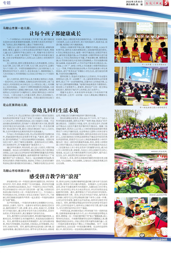 马鞍山市第一幼儿园: 让每个孩子都健康成长 “一个学期的幼小科学衔接工作开展下来,最可喜的变化是家长的焦虑情绪明显缓解,本学期大班流失率明显下降。”说到这,园长周建华脸上露出了欣慰的笑容。 为建立幼儿园与小学科学衔接的长效机制,减缓衔接坡度,降低儿童进入小学后出现适应困难的可能性,帮助儿童从幼儿园顺利平稳过渡到小学,周建华结合园所实际,带领市一幼骨干教师制订了专属的科学衔接实施方案,分段分层帮助园所幼儿实现从幼儿园到小学的顺利平稳过渡。 在小班阶段,园所主要是培养幼儿的养成教育,分别从生活习惯、卫生习惯、学习习惯、礼仪习惯、安全行为、品德行为六个方面入手。中班阶段着重培养幼儿各方面的能力,主要体现在对专注力、自控力、语言表达能力、情绪管理能力、人际交往能力、时间管理能力以及独立思考能力七个方面的培养。 进入大班阶段,园所开始从各方面真正做到幼小衔接。一是在时间上的互相靠拢,在集体活动时间的安排上做了适当延长,时间安排在35分钟左右,让小朋友在心理上、时间概念上有好的准备。二是学习习惯和常规要求互相衔接,大班后期开始培养幼儿掌握正确的坐姿、写姿、握笔姿势,并注重培养幼儿内在的学习兴趣和动力,使他们顺利适应小学的学习生活。三是生活能力上的重点培养,使幼儿在自理能力、时间概念等方面打下良好的基础。四是注重语言表达能力的培养,使幼儿得到更多语言锻练的机会。五是加强阅读能力的培养,让幼儿在有目的、有计划的阅读中,阅读方法、阅读兴趣、阅读能力有大幅度提高。 为使幼小衔接实现平稳过渡,周建华介绍道,从2021年秋季开始,园所在大班的课程安排上采取循序渐进的原则。9月份以常规活动为主,每周一举行升旗活动,定期召开家长会,填写家长调查问卷;10月份邀请小学教师和家长进行座谈会;11月份区角投放绘本书籍,开展故事比赛、情景剧表演;12月份举办家长沙龙为家长答疑解惑;1月份加强晨间锻炼(如跳绳、足球活动等);3月份开始开展各项主题活动,如:“准备上小学了”、参观小学等;4月份邀请小学教师来园给幼儿上一节课,开展各类实践活动等;5月份则会邀请小学生来园座谈,进行“现身说法”并模拟小学生生活,进行座位的调整、作息时间的调整等等。 园所的努力,受益的无疑是幼儿以及家长,作为全国足球特色幼儿园,市一幼招聘了一名上海体育学院毕业的体育教师,成立了市一幼音体教研组,注重对幼儿的体能训练,让每个幼儿微笑着拥有健康。“每周的体能课是孩子最期待的,现在我儿子变得更开心,更爱笑,更自信!”太阳一班王怿灿妈妈表示,看到孩子每天开心的笑脸,自己也很开心。 周建华也表示,未来有效科学衔接工作将持续开展并不断创新,让在市一幼的每一位幼儿都能真正健康快乐成长。 花山区第四幼儿园: 带幼儿回归生活本质 3月8日上午,花山区第四幼儿园大班的小朋友们在园长妈妈和老师的带领下走进了学校门口的超市。原来今天是三八妇女节,小朋友要给妈妈送上自己准备的小惊喜。不过送惊喜也是有规则的,因为每个小朋友都只有5元钱,要在限定的价格区间内选定最心仪的礼物可不是一件容易的事呢!经过比较与计算,最后小朋友们都选到了自己心仪的礼物,生活中的数学也在真实的购买中完美地融入。 作为幼小科学衔接试点园,花山四幼拥有得天独厚的条件,那就是园所周边社会资源非常丰富,气象局、银行、菜市场、图书馆等都成了小朋友实践课程的实践基地。在园长郑怡的介绍下,我们了解到主题课程一直是四幼的主打课程,并已经持续多年,而“有趣的数字”就是其中之一。 通过多年的教学,郑怡发现,幼儿进入大班后,对数字越来越敏感。结合幼儿的年龄特征、最近发展区以及已有的数活动经验,让幼儿能从生活和游戏中感受事物的数量关系并体验到数活动的趣味性和重要性,她带领园所骨干教师设计了“有趣的数字”这个主题活动。和幼儿一起去探秘数字的起源;发现身边的数字;和数字做朋友、做游戏,引导幼儿在实际的操作和游戏过程中感知数字的实际意义,了解数字在我们生活中的运用,并通过自己的操作体验到学习数字的乐趣。 类似的课程还有很多,例如2021年下半年,为了与幼小科学衔接完美接轨,园所还开展了“我想 我能 我成长”的升旗主题活动。王副园长介绍道,往年,在大班生活中,四幼都会开展由幼儿担任升旗手及护旗手的升旗活动。随着二胎家庭的增多,很多幼儿从已经上小学的哥哥姐姐那里时常获得关于小学生升旗的信息,也会带来幼儿园和小伙伴分享与讨论。借着幼小科学衔接的契机,园所尝试将自主权交还给幼儿,让他们按照自己的想法选择想在升旗活动中担任的角色并坚持到底,那是否可以让幼儿身临其境地感受小学的升旗仪式?经过一段时间的摸索和准备,现在,参观小学特别是小学的升旗活动,已经成为四幼幼小科学衔接系列活动之一,旨在激发幼儿对小学生活及学习的憧憬与向往,减少幼儿对小学的陌生感、神秘感,为适应小学生活做好充分的心理准备,也让幼儿在不断的探索和讨论的过程中,提升自己在交往、合作、承担责任等方面的学习品质。 郑怡表示,未来,园所还将继续研磨更多的园本类主题活动,与生活接轨,与社会接轨,让每位幼儿都能获得真正的长足