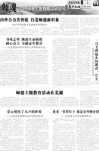 ——记灵璧县向阳乡苏圩小学教师孙宜忠 提起灵璧县向阳乡苏圩小学的孙宜忠,当地人无不竖起大拇指称道这位为了教育呕心沥血、披肝沥胆的人民教师。1975年,他踏上教育这块热土,如今已默默走过了35年。这35年来,他一直踏踏实实、兢兢业业地工作着,满腔热情地献身于党的教育事业,出色地完成上级领导、学校交待的每一项任务,成绩卓著。 今年已是58岁的孙宜忠,从不因自己的年龄大,而甘愿落在青年教师的后面,反而以自己的顽强拼搏走在了他们的前面。2003年暑假,天热得让人喘不过气来,人们不得不寻找最凉爽的地方去躲避这大自然带来的苦难。而他却每天照例来到二楼的办公室,这里只有一台吊扇拼命地转着,送给他一股股火热的风。他就在这样的环境下坚持学习普通话和计算机。一个多月过去了,经省语委测评,他的普通话已达到二级甲等的水平,电脑也能正常操作了。 就是这样一位尽忠职守的好教师,却被病魔无情地折磨着。孙宜忠长期患有一种难以治愈的脊髓炎,脊髓骨严重变形,病变处时刻向外流出脑髓液,致使他一年四季后背上的衣服总是湿漉漉的。衣服贴在疮口上,那种滋味可想而知,令人望而生畏。而他总是咬着牙忍着痛,不露声色,也从来未因此而少给学生上一堂课。 2000年冬天,孙宜忠的脑髓液流得太多,致使面色苍白、神志不清、四肢无力,就连起码的行走也难以保持平衡,曾几度昏倒在讲台上。在学校领导和师生的一再催促下,他接受了大家的建议,赶往蚌埠市肿瘤医院接受治疗。 安排好班级事务后,他来到蚌埠市肿瘤医院,经过多位专家汇诊,一致建议立即手术。即便如此,他每天仍打几次电话回学校,问这问那,就连说梦话也是给学生上课的内容。在等待手术的日子里,他再也躺不住了,不顾医生的反对,义无反顾地重新踏上了这神圣的三尺讲台。 在后来五个多月的保护治疗中,他总是拔掉针头后精神饱满地走进课堂。大伙都说他:在家里是病人,出门是好人,工作起来是强人。 正如灵璧县向阳中心学校校长王洪峰所说:孙宜忠是党的教育事业战线上的忠诚战士,是陶行知先生的忠实后生,是身残志坚打不垮的英雄!