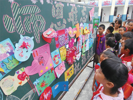9月9日,蚌埠市回民小学开展了一系列庆祝教师节的活动,全校学生制作的形态各异、五彩缤纷的谢师卡在校园内展出;中年级各班开展了一次“尊师重教,为人师表”的班会活动;全校教师签订了一份“师德八项承诺书”;校领导探望并慰问了患病教师,向患病教师表示节日的问候。图为学生们制作的“谢师卡”。