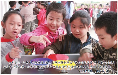9月26日,由安庆市科技馆、迎江区科协联合举办“科技馆进校园”科普宣传活动在安庆市华中路第二小学举行,这是安庆市首次将科技馆搬进校园,与学生零距离接触。 □胡思琪 黄小卉/摄