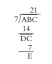 2.把个位数C移下来,组成两位数 ,根据题意 ÷7的商是1,1写在被除数中C的头上。1×7=7, -7的差只能是一位数,假设为E,且E<7。(理由同上)