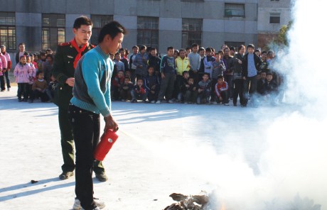 11月9日,马鞍山市佳山中心小学联合武警马鞍山市消防支队金瑞中队共同开展了一场“119”消防日安全疏散演习活动。图为消防疏散演习结束后,该校学生在消防官兵指导下操作灭火器扑灭火堆。 □周小军 张 宏/摄