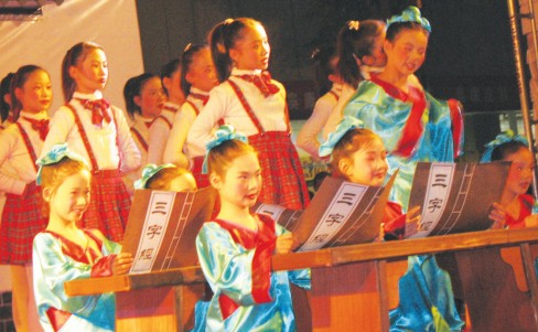 □洪 波/摄 近日,在由潜山县委宣传部、县文明委主办,县教育局、县文广新局承办的“诵读经典,爱我潜山”大型文艺活动中,潜山县彰法山小学的《三字经》颂舞融合诵读、吟唱、舞蹈元素,以创新、活泼的风格,再现古私塾情境,烘托出一篇古今相衬、动静结合的和谐乐章,受到广泛赞誉。