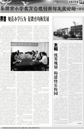 太和 统筹规划 构建快乐校园 县教育局基教科李科长向我们介绍了太和县基础教育的概况。太和县是一个农业大县,也是教育大县,全县辖31个乡镇,面积1822平方公里,人口167.5万。现有幼儿园33所,在园(班)幼儿25513人;小学357所,在校生139421人。《安徽青年报》在太和县的一小、四小、五小、六小、九小共五所小学都建立了学生记者站。 2001年至2008年,太和县全面完成中小学危房改造任务,15万名学生搬进新教室。2008年,又完成了第一轮农村中小学布局调整,公办中小学从2005年初中90所,小学509所,调整为初中69所,小学368所。基本形成了“初中设置合理,小学规模适度”的学校布局。目前该县正在进行新一轮布局调整,即实施“1515”工程:重点建设100所小学、50所中学、15所高中,力争通过本次布局调整,形成基础坚实、布局合理、结构优化、规模适当、质量更高的基础教育新局面。 在农村学区建设方面,根据“先试点、找经验、有模式、据实情、分步走”的原则,太和县确定了胡总中心小学、税镇中心小学为试点学校。两校的基础设施正在加紧施工。从现场的施工情况看,建成的两校无论是在规模上,还是在硬件设施上,都非一般农村小学可比。两校可分别在2010年秋季和2011年秋季开学投入使用,可容纳全乡镇小学四、五、六年级段学生。调整保留的教学点办幼儿园和小学一、二、三年级,既能确保低龄儿童就近入学,又能充分利用原危改校舍和可用教学设施,避免了因布局调整带来的教育资源浪费。 学校的统筹规划也在推进着教育质量往更高的层次发展。该县提倡特色教育,如将古诗文朗诵贯穿到课堂上,在30分钟的大课间活动中,学校有组织、有计划的开展舞蹈、跳绳、围棋等活动;对学生实行人性化的管理和教学,采取减少考试次数和不排名次的做法,在注重学生学习质量的同时加大对学生心理因素的重视,真正做到内外兼顾,推动学生全面发展。花园式学校的创建也是该县教育工作的亮点之一,该县共创建国家级花园式学校1所,省级花园式学校3所,市级花园式学校154所,市级绿色学校10所。其中市级花园式学校占该县公办学校总数的三分之一,占全市市级花园式学校总数的百分之三十。 在太和县胡总中心学校范校长的带领下,我们参观了这所花园式学校。步入胡总中心小学,就如同进入了一个安静优雅的公园,学校高度重视环境绿化美化,现有怡心园、德育园、读书园、花架木亭等景观。运动场上草坪如茵;怡心园内景色别致;德育园里净心修身;读书园内书山有路,道旁树木四季常青,错落有致,俯仰生姿。校园内四季风景如画,各种花草树木共计百余种,名为校园,胜似花园。2004年,学校荣获“安徽省花园式学校”称号。在布局精巧、给人惊喜不断的校园里行走,记者也不由自主地被眼前的景色所感染,眼前仿佛浮现出小学生们或在读书园认真读书,或在运动场上欢快奔跑的场景。