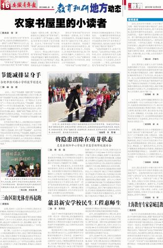 新闻速递 近日,肥西县上派新五小召开全体体育教师教研工作会议。学校领导组与各体育教师就学校新置体育器材的管理与使用、课堂教学常规的改进、全校广播体操的比赛细则等进行了热烈讨论,并达成共识。赵立江校长强调全校师生要继续加强“两操”活动,有声有色地开展班级课外活动,严格执行《学校体育工作条例》,积极开展教学教研活动,转变教学观念,做好常规体育教学与训练工作,把课题的研究工作纳入日常教学,稳步开展下去。 11月30日,亳州市谯城区教育局工会主席赵敬明一行五人来到该区牛集中心中学,全面检查该校的校园安全工作,重点对该校的各项制度建立和执行情况、学校门卫管理、校园重点场所、重点部位(电子监控、栏杆、楼梯通道、灭火设施、食堂、宿舍等)的安全保障工作、应急管理机制的建设情况等进行了全面检查,并充分肯定了该校的安全防范工作。 近期,铜陵市东方红小学根据国家卫生部门颁布的“无烟学校标准”,在广大师生中广泛开展戒烟、控烟、无烟活动。该校成立了控烟领导小组,建立了严格的禁烟规章制度,制定了切实可行的控烟工作计划;并利用健康教育课、团队活动、主题班队会、黑板报、小广播等各种形式,对学生开展吸烟有害健康的宣传教育,增强他们的自我保健意识和能力。全体教职工和学生共同参与控烟活动,人人争做控烟主人,为创造一个文明洁净的工作和学习环境而努力。 近日,潜山县希望小学被中国少年科学院授予“中国少年科学院科普教育示范基地”称号。该校两名同学获中国少年科学院“小研究员”证书,两名同学获“预备小院士”称号,一名同学获“小院士”称号。据悉,该校以少先队为阵地,以活动为载体,注重实践育人、寓教于乐,于近期组织了“创建中国少年科学院科普教育示范基地”活动,开展小调查、小研究、小课题的科普教育,引领孩子们动手动脑,实践探究,培养科学精神。