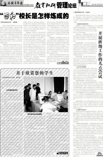 校长论坛 “四和”校长是怎样炼成的 □肥东县锦弘中学 杨强劲 温家宝总理在全国教育工作会议上强调,要“努力培养和造就一大批具有先进教育理念、独特办学风格的人民教育家”。到底什么样的人才最容易成为教育家呢?笔者认为,校长是最有可能成为教育家的人,大教育家苏霍姆林斯基、陶行知等都是校长出身。当然,教育家的成长不在“速成”,而在“养成”,需要丰富的经历和体验,需要大量的积累和提升。那么怎样的校长才是“好校长”,笔者认为“四和”校长就是好校长。 人格和美 校长要德才兼备,德在才之先。古人说得好,“经师”易得,“人师”难求。校长是“人师”的管理者,没有高尚的人格,如何管理好学校?优秀的校长在人格上应有更高的追求。因此,校长必须具备良好的道德品质,有抵御各种诱惑的能力,遵守社会公德,严于律己,以身作则,要有强烈的家庭责任感和社会责任感,在学校管理中才会有很强的感召力。“人不率,顺不从,身不先,则不信”,校长的个性修养应具有明朗快活朝气蓬勃、积极向上的精神。在治校过程中,要表现出热爱学校、热爱教师、热爱人生、精神饱满、积极向上。校长要用自己开朗的性格、健康的情绪去影响班子、教师及周围所有的人,这种性格有利于产生巨大的人格魅力,建立良好的人际关系;有利于克服逆境和心理挫折,对学校管理产生积极影响。 管理和顺 “管理”是一项复杂的系统工程,笔者认为它包含两方面的内容,即“管”和“理”。“管”侧重于用制度、章程等既定性条例实施常规性运作,因此要想让一所学校有序高效运转,其前提是有一套符合社情、民情、校情的行之有效的规章制度。因此,作为校长,应不断完善学校的规章制度,在执行坚持公平、公正、公开的原则,使全体教职工在制度面前人人平等,心服口服。“理”则倾向于校长通过培养自己驾驭复杂局面的大智大慧,在统管全局的基础上,广开言路、集思广益,对学校工作进行合理的谋划、协调与安排,体现轻重缓急、张弛有度,使之如流水一般顺畅无阻,“润万物而无声”。唯有如此,才能使学校风清气正、欣欣向荣、和顺有为。 教育和雅 在现行的教育评价体系中,如何有效提高素质教育是实现“教育和雅”的关键。教育自古以来都是文化、文明的传承方式,因此,实现“教育和雅”必须要正确认识学校教育的意义和作用,校长要有正确的管理理念,敢于突破藩篱,开展适合“人”发展的教育项目,不仅着眼学生在校三年的学业发展,更关注学生未来三十年的人生发展,使学生通过学校教育能够成为适应社会需要、进行自我心理调节的合格的“人”,这便是笔者所认为的“和雅教育”。 校园和谐 在构建和谐社会的大背景下,作为凝聚着知识、智慧积淀的学校,校长更应倡导“和谐”,构建和谐校园。通过组织师生活动、优化校园环境、改善校风校貌、建设校园文化等举措,使“和谐”二字融入到学校管理、师生交往、课堂教学中去,校长还要立足于学校实践,着眼于学校未来,唤醒师生的文化意识,提升学校的文化品位。文化品位提升了,校园中的和谐态势自然就会逐步形成。 不是每个校长都能成为教育家,但每个校长都应以教育家胆略来办学,以教育家型校长作为目标来追求,具有这样的胆略和追求,才能把学校办好,使我们的教育事业更加兴旺发达。