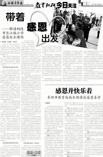 铜陵市长江路小学用教学实践证明了一切:自学校决定将感恩教育作为校本研究以来,长小收获了感恩教育的一片片绿洲,体验到了一颗颗心灵正不断升华,告别“不毛之地”,走向“鱼米之乡”。