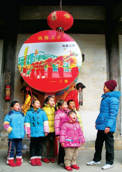 别样文化餐香甜山里娃 地处皖浙交界处的歙县三阳乡,曾在2008年被国家文化部命名为“中国民间艺术之乡”。为了让山村留守未成年人过上丰富多彩、不同寻常的寒假生活,歙县三阳学校聘请了三阳村的洪奶奶,教唱孩子们具有徽州情韵的民间小调。不定时、分批组合的教唱形式,吸引了该校不少中小学生的积极参与。此项活动的开展不仅丰富了当地中小学生的“民俗文化大餐”,也推动了当地“非遗”的继承与发扬。图为洪奶奶在三阳村祠堂内教唱《秋千曲》。