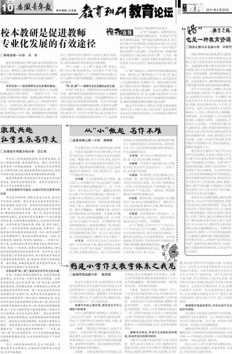 学科拾贝 激发兴趣让学生乐写作文 □太湖县天华镇沙场小学 汪仁伟 作文是一种创造性的活动,但对学生来说,它是一种综合性强、难度高的作业。因此,怕写作文是学生中一种普遍的现象。如何改变学生怕写作文、讨厌作文的心理,激发和培养他们喜欢作文、乐写作文的兴趣,则是我们语文老师值得探究的问题。 教学实践表明:成功地进行作文指导是学生乐写作文、写好作文的有效手段。我在作文教学中,是从以下几方面来入手的。 为学生提供写作素材,让他们写自己愿意写的内容 作文离不开材料,材料又来自于生活,来自于平时的细心观察。许多学生往往在作文时觉得心里空荡荡的,没啥可写。如果我们在动笔前给学生充充“电”,让他们多看看、多说说自己乐于写的事物,那效果就会迥然不同。有一次,在指导学生状物的作文课上,我让每位学生准备好一个自己最喜欢的水果,上课时都放在课桌上,先让他们仔细观察。同学们带来了各种水果:苹果、梨、香蕉、桔子、菠萝……大家你看你的,我瞧我的,可带劲了。我指导他们仔细观察水果的颜色、形状、掰开或切开以后内部的样子,再让他们都尝尝味道。这时,大家看的看、闻的闻、咬的咬、切的切……兴趣十足。接下来,我再让他们用自己的语言把水果的形状、颜色、味道一一说出来,在各自交流的基础上,再让他们动笔把刚才说的内容写下来。这次作文,由于学生掌握了丰富的感性材料,所以他们的习作把自己喜爱的水果写得形、色、味俱全,取得了很好的效果。由此看来,加强直观指导,能丰富写作素材,为学生写好作文增添了无穷的乐趣。 灵活运用“画一画”,激发学生乐写作文的兴趣 学生一旦遇上写景状物的作文,就很容易出现东扯西拉、主次不分、又写不出特点的现象。此类作文的指导,我们不妨用“画一画”的方法,这样印象会更深刻,学生都爱画画,让事物在纸上重现,将会激起学生的写作兴趣。有一次我在指导同学们写校园中的“大青松”时,先带大家去校园转转,让他们仔细观察其中一棵大青松,回到教室后,我先让学生在纸上把观察到的大青松画一画,再让大家对照刚才看到的大青松评一评,学生们的情绪很激动,你一言我一语的作出了客观的评价:“它的叶子不应这样粗,是又尖又细又密的”。他们在争辩中探究,发现松树的特征,这样获取的知识印象就深刻了。再让他们讨论松树颜色、形状等方面有什么特征。有的学生还用上了生动的比喻:“像保卫校园的卫士”、“像巨大的撑开的绿伞”……可见,把“画一画”引入作文教学中,可以立竿见影地激起他们思维和智慧的火花,从而为写好作文打下了坚实的基础。 总之,兴趣是最好的老师,是入门的向导。只有具有学习兴趣的人,才会把学习看作内心的满足,而不当成负担。