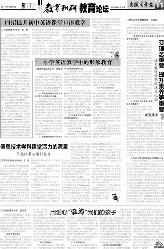 班主任驿站 用爱心“滋润”我们的孩子 □滁州市清流小学 张安蓉 师者,传道授业解惑也。这是古人对老师的一种概括和解释。那“师者的责任仅仅是传道授业解惑吗?”当然远远不止这些啦。在这几年的风风雨雨中,在无数次的摸爬滚打中,我对如何做好班主任工作,提高学生思想工作实效有了一些浅薄的体会。 一、班主任要有爱心 对于小学生来说,六、七岁正是他们在父母身边撒娇的年纪,正是他们对世界充满好奇的年纪,正是他们好动、好玩的年纪。因此,对于一些童趣十足,无伤大雅的举动,我总是宽容对待,用一种“慈母”般的眼光欣喜地关注他们的成长,欣赏他们的可爱之处,保护他们珍贵的童心。“爱的力量是无穷的”,学生在师爱的沐浴下轻松快乐地学习、生活,即使他们违反了纪律,老师批评时也要动之以情,晓之以理,更要让他明白:老师是关心你、爱护你的,是为你着想才如此严格要求……精诚所至,金石为开。“师爱”如无声的春雨必定滋润孩子们的心灵,实现爱的迁移。 二、班主任要细心 有人说班主任是世界上“最小的主任”。可这“最小的主任”管的事却特别多、特别细。大至教育教学工作,小到扫地、粉笔之类鸡毛蒜皮的小事,样样少不了班主任操心。因此,班主任应有一颗纤细如发的心——细心。在工作中,我认真做好“六个勤”,即“勤观察、勤交流、勤家访、勤鼓励、勤表扬、勤记录”。这样对学生各方面情况了然于心,才能因材施教。不厌其烦,不厌其细,时时抓,细细抓,是班主任工作不可缺少的。 三、班主任要有耐心 每位班主任都会遇到差生的转化问题。对于一些学习有困难、行规有问题的学生,班主任对他们不仅应施以爱心,施以细心,更应施以耐心。班里的小杨同学是最令我头痛的一个学生,平时自控能力极差,学习又极不认真,经常在班内闹出点事来。我一次次苦心策划的转化计划都宣布失败。在认真学习了“成功教育”理论后,我深刻反思自己的工作,重新调整工作方法和策略。我开始密切关注其行为表现,哪怕是微小的进步,都及时地给予恰如其分的表扬,使他确立自信,获得成功的喜悦。 四、班主任要有“创新” 班主任平时应多注意学生的特长爱好,多注意各方面的培训信息,与家长沟通好,做好家长、学生的思想工作,让他们积极参加培训。音乐、舞蹈方面培养三至四人;美术、书法方面培养五至七人;体育方面要达到全班人数的三分之一以上。有了这些“小人才”,无论是出黑板报,制作宣传栏,举行文艺演出,还是召开运动会,都会让你省心不少,并能取得理想成绩。 尽管近几年的班主任工作尚不够尽善尽美,但我确已尽心尽职。我总想,如果每个班主任都能以爱心、耐心、细心去面对工作、面对学生,就“没有过不去的坎,没有解决不了的问题”。