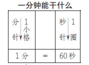 教学内容: 北师大版小学数学二年级上册66—67页。 具体内容: 1分钟时间的长短;分和秒的关系。 教学目标: 一、知识与能力 1.要求学生正确把握1分钟的时间感。 2.引导学生认识在1分钟内能做些什么。 3.理解分与秒的关系。 二、过程和方法 1.通过听秒针走动的声音唤起学生对钟表的印象。 2.通过观察认识钟面上的不同指针。体会1秒、5秒、1分钟的长短。 3.运用课件,让学生正确认识分与秒之间的关系。 4.运用自主式学习,让学生自己来讲述1分钟能干些什么。 三、情感态度与价值观 1.通过本课的学习,使学生更加珍惜时间,培养学生正确的时间观念。 2.将本节课与现实生活相结合,培养学生的数学兴趣和对生活的热情。 教学重、难点及教学突破: 一、重点 1.体会1分钟的长短。 2.理解分与秒之间的关系。 二、难点 理解1分钟的长短。 三、教学突破 对于“一分钟能干什么”这个问题,既是本课重点,也是难点,教学中本人借用多个实例,让学生身临其境地去感受、去体会,从而把握住难以阐述清楚的时间长短概念,并让学生从自己的观察感悟中得出结论。 教学用具: 多媒体课件若干张,作业卡两张,皮球2—3个。 教学过程: 一、创设情境,引入新课 1.出示课件,听秒针走动的声音,从中唤起学生对钟表已有的认识。 2.学生通过观察时钟,能从不同角度对钟面上的三根指针进行认识及对秒针走动的感觉,设问秒针走1小格多长时间?体验1秒钟的长短。 二、探究新知 1.直观感受。出示课件“1分”动态演示,秒针走1圈,设问:秒针走1圈多长时间? 2.自主探究。同桌交流,师板书秒针走1圈60秒。老师适时点拨学生想、数、算,并补充。 3.再次出示课件“1分”,运用动态演示。让学生体验时与分的关系。 4.最后师板书,使学生从感受中得出结论:1分=60秒。 三、感受新知 出示动态钟面及1分钟音乐课件,让学生通过听1分钟音乐感受1分钟的长短。 四、实践体验新知 出示动态1分钟钟面,让学生在老师设计的读书、写字、拍皮球活动中选一项,实践1分钟能干什么。 五、交流、拓展 1.通过以上的感受与实践,拓展想象,生活中1分钟还能干哪些事情。让学生谈谈,老师板书课题。 2.全班交流,宝贵的1分钟还能干什么。教师使学生拓展知识面,出示收集的有关资料。 出示课件: 高速的火车1分钟可行驶4000米; 小汽车1分钟行驶2000米; 小华1分钟跳绳150下; 小芳1分钟读250个字。 3.让学生动手操作、感悟1分钟的长短,并验证估计与实际是否接近,再次体验1分钟的长短与1分钟能干什么。 4.出示课件,两分钟动画,让学生在轻松愉悦的环境中感受两分钟时间的长短,明白感觉时间的长短与我们喜好、心情都有关系。 六、提出问题,渗透德育教育 1.教师提出问题:1分钟的时间与以前学的1天、1时相比是长还是短? 2.教师点拨,一分钟虽短,但很重要。 3.讲一个真实的故事(录音),让学生实际感受1分钟的重要性。 4.让学生相互交流,谈感想,渗透德育教育。 七、巩固拓展(你1分钟能完成吗?) 1时=( )分 75秒=( )分( )秒 1分=( )秒 小华每天睡9( ) 1分20秒=( )秒 一节课410( ) 八、课堂总结 这节课我们一起发现了1分=60秒,也感受了1分钟的长短,知道在1分钟里能干许多事情,大家都明白了(出示课件)“我们要珍惜每一分钟”的道理。 九、 布置课外活动 请小朋友在星期天,和爸爸妈妈一起到室外测试一下自己1分钟能跑多少米?把数据记录下来,到学校和同学们交流。 板书设计: